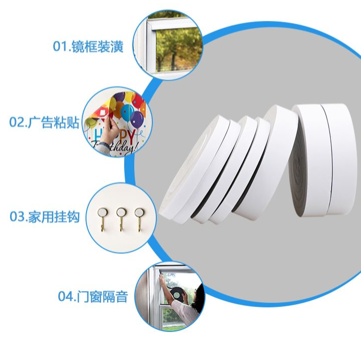 泡棉胶带主要用于电子电器产品、机械零部件、各类小家电、手机配件、工业仪表、电脑及周边设备、汽车配件、影音器材、玩具、化妆品、工艺礼品、医疗仪器、电动工具、办公文具、货架展示、家居装饰、亚克力玻璃、陶瓷制品、运业的绝缘,粘贴,密封,防滑与缓冲防震包装。基材 EVA、XPE、IXPE、PVC、PEF、EPDF等。
