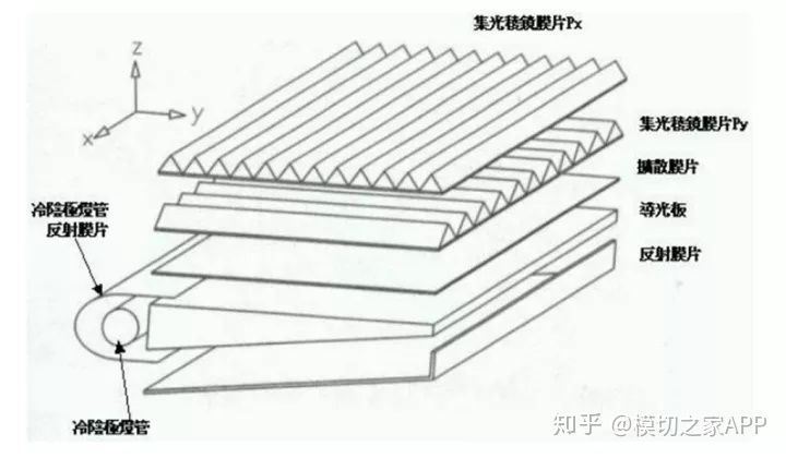 背光模组的关键零组件主要组成为发光源(Light source)、导光板(Light guide plate)、胶框(housing)、反射片(Reflector)、扩散片(Diffuser)、增光片(BEF、棱镜片)、黑白胶(Curtain Tape)等。